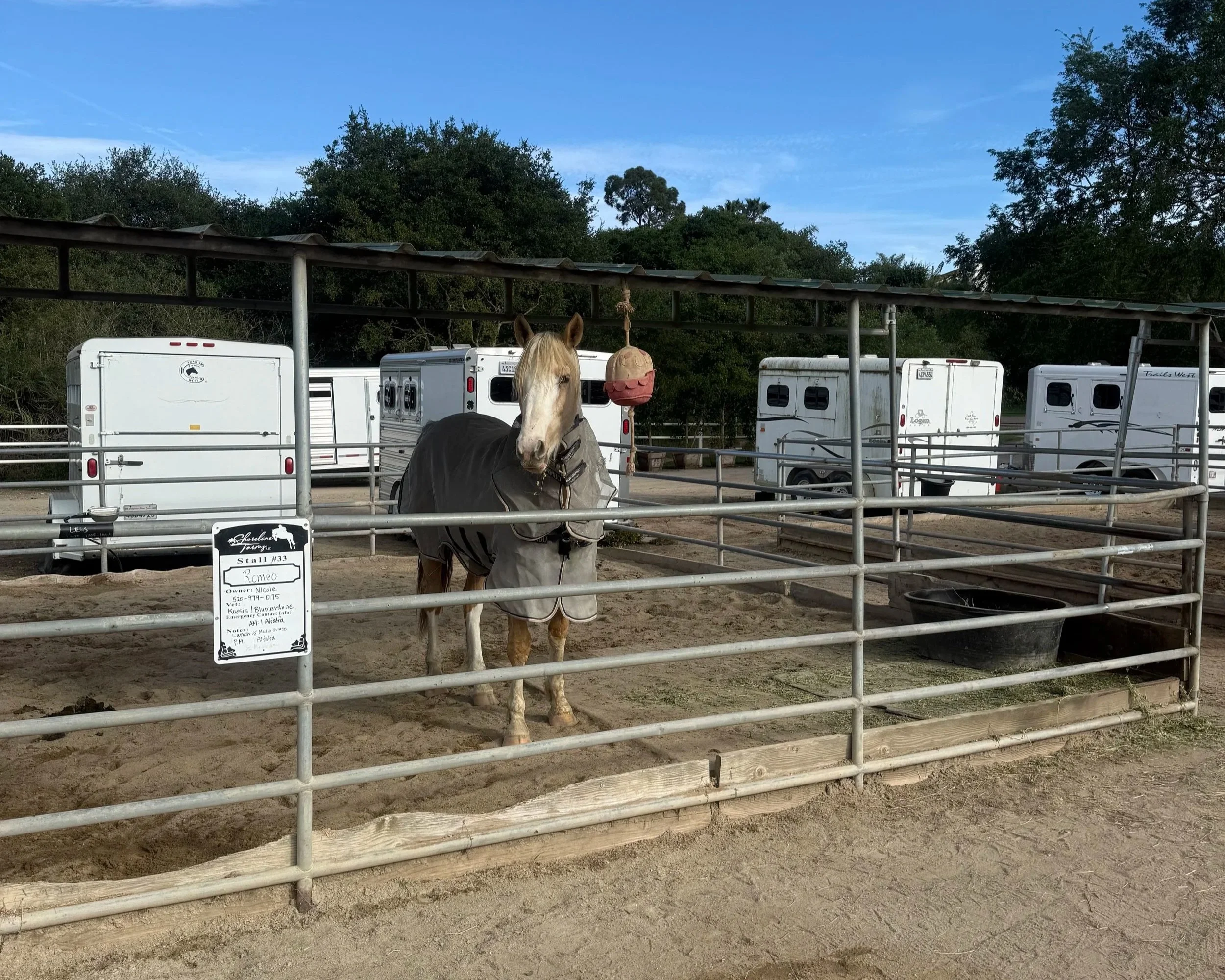 Amenities include: Automatic waterers, cleaning twice daily, hay three times daily, daily grain service, turn out five times a week, blanketing daily , and common area tack room.